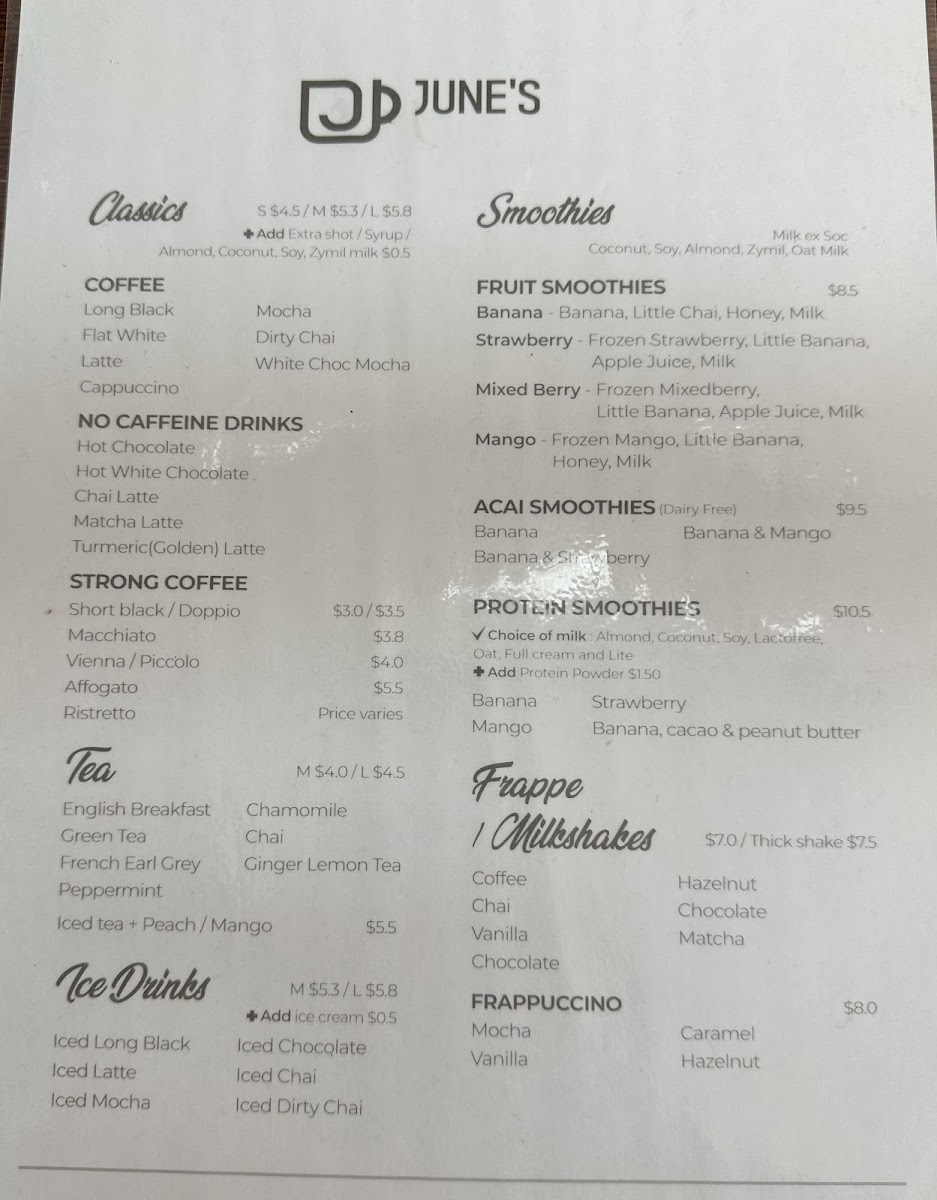 June's cafe Rochedale South Menu